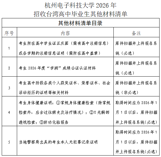 附件1:杭州电子科技大学2026年招收台湾高中毕业生其他材料清单